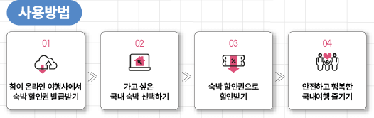 해당 홈페이지에서 가고 싶은 국내 숙박 업소를 선택하고, 발급 받은 할인쿠폰을 적용하면 간편하게 예약 완료 가능합니다.