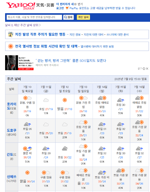 야후 재팬 날씨 사이트도 일본 여행객 사이에서 많이 이용되는 사이트입니다. 간단한 일본어만 알아도 바로 볼 수 있고 일본어를 몰라도 번역기능을 활용하여 쉽게 볼 수 있습니다.