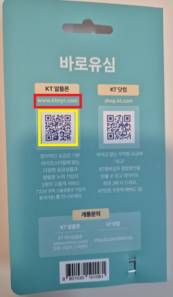 KT m 셀프개통은 홈페이지(https://www.ktmmobile.com)에 접속하시거나 구입한 KT 바로유심 뒷면의 QR코드로 빠르게 접속할 수 있습니다. 저는 QR 코드를 활용해서 접속했습니다.