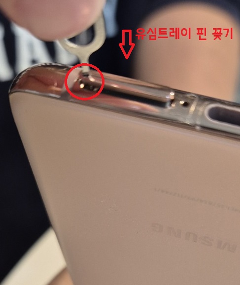 유심트레이는 보통 휴대폰 상 또는 하단에 위치해 있습니다.제가 사용한 갤럭시 S21+ 모델의 경우, 유심 트레이가 하단에 있어 분리할 때 하단부분을 확인했습니다.